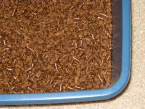 Purr & Simple does make a Kwik Klump formula, which I’ll also review here in a few weeks. If you prefer pellets, consider using them with the self-cleaning litter box designed for Feline Pine, or a similar litter box sold at pet stores. Of course, you don’t have to do this, but the advantage of such a box is that it traps all the loose debris that forms after some of the pellets break down. If you do use such a pan, you’ll need to empty the bottom a few times before the litter change.