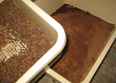 You’re supposed to rake the litter with a scoop to mix in the wet and dry litter. If you do that with the self-cleaning box mentioned, then the broken down litter will fall to the bottom. In the photo below, you can see the dirt-like debris that collects under the sifter part of the pan. If you don’t use a pan like this, you could notice tracking.