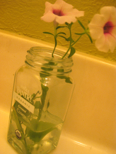 I dropped my freshly snipped petunias into an old cumin spice jar I’d been saving.