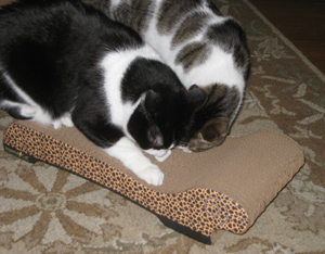 Choco (black and white kitty below) loves his Scratch ‘n Shapes Cheetah Chaise!