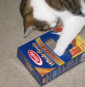 In this case, all I had to do was remove the window cling from this pasta box, throw in one of Oscar’s beloved ponytail holders, and instant new (and free!) kitty toy.