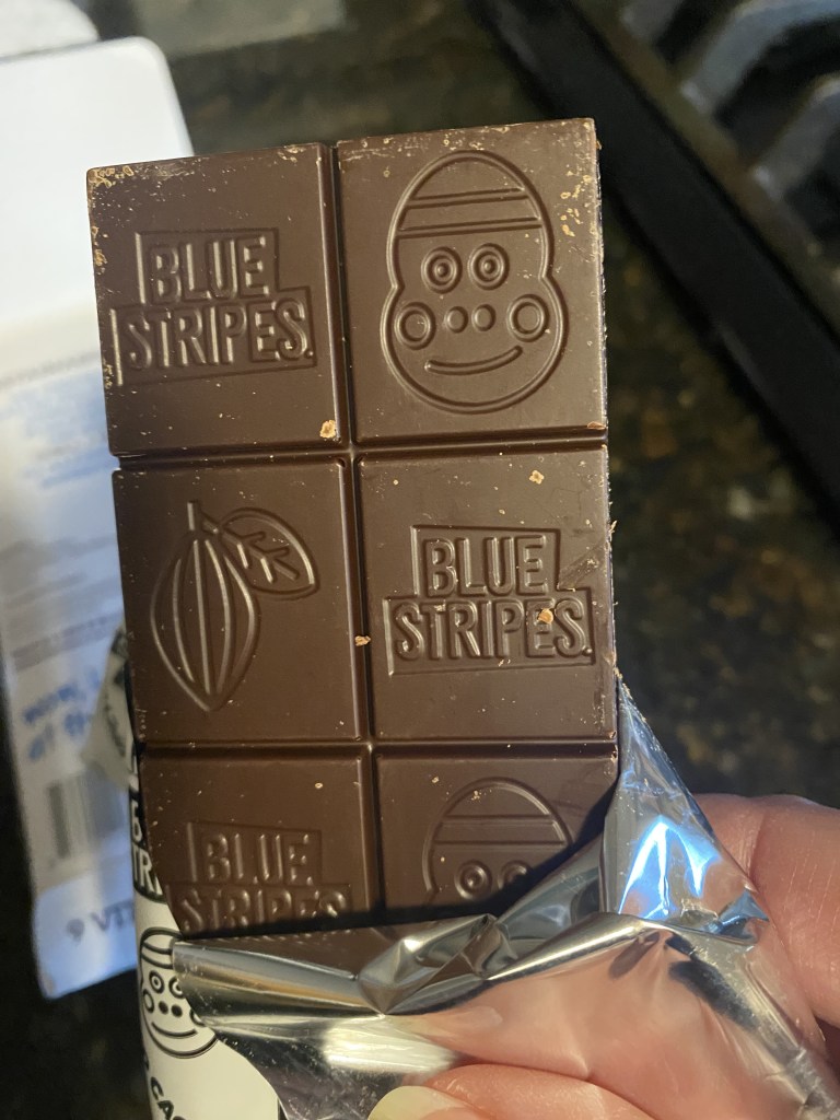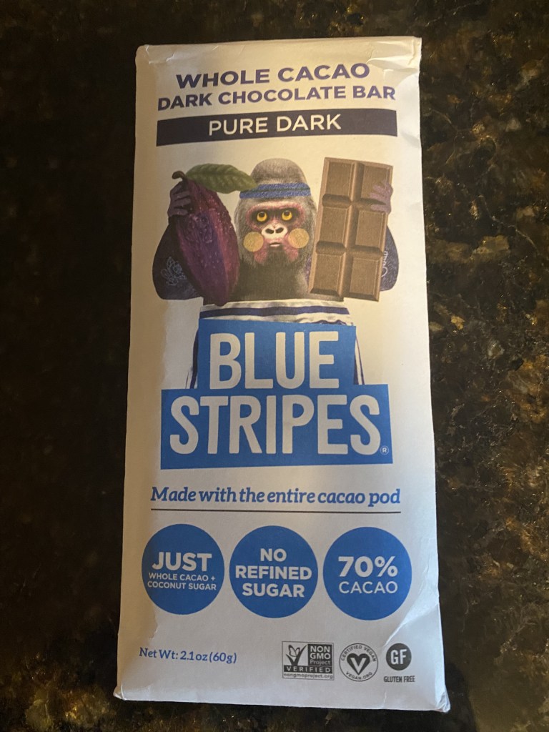 A few weeks ago I decided to try something different while shopping at Whole Foods: Blue Stripes Chocolate Bar with Whole Cacao. Yum. It’s different and tastes different.