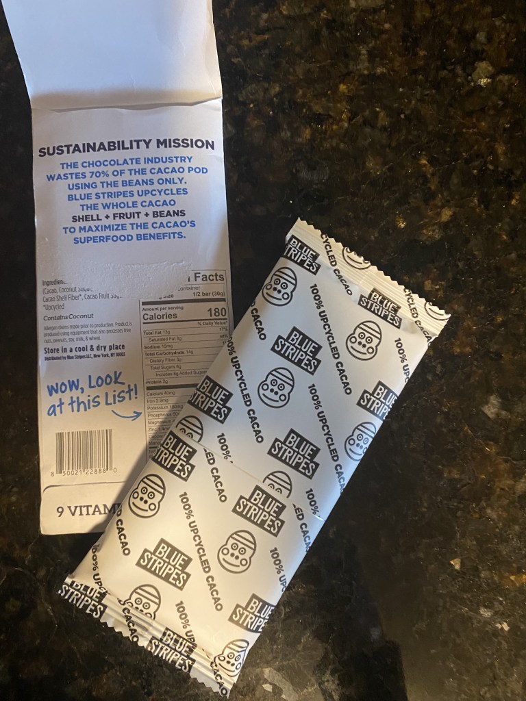 Blue Stripes uses the whole cacao pod to let you have more superfood benefits and eliminate waste in production. It’s difficult to describe the taste, but I’d say more “wholesome” while still being delicious. You kind of crave it.